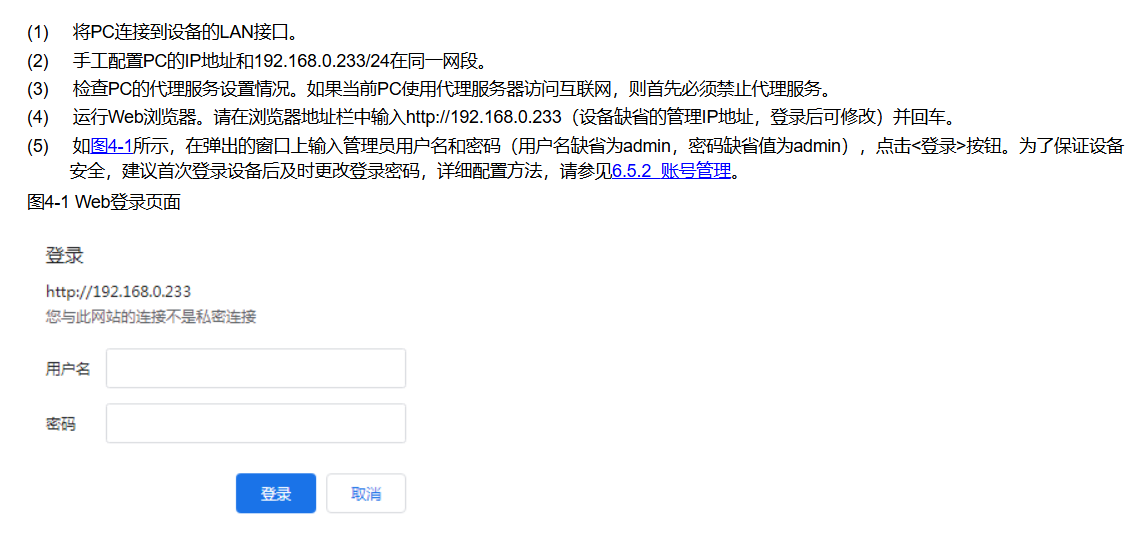 (5) 如图4-1所示,在弹出的窗口上输入管理员用户名和密码(用户名缺省为admin,密码缺省值为admin),点击<登录>按钮。为了保证设备安全,建议首次登录设备后及时更改登录密码,详细配置方法,请参见6.5.2 账号管理。