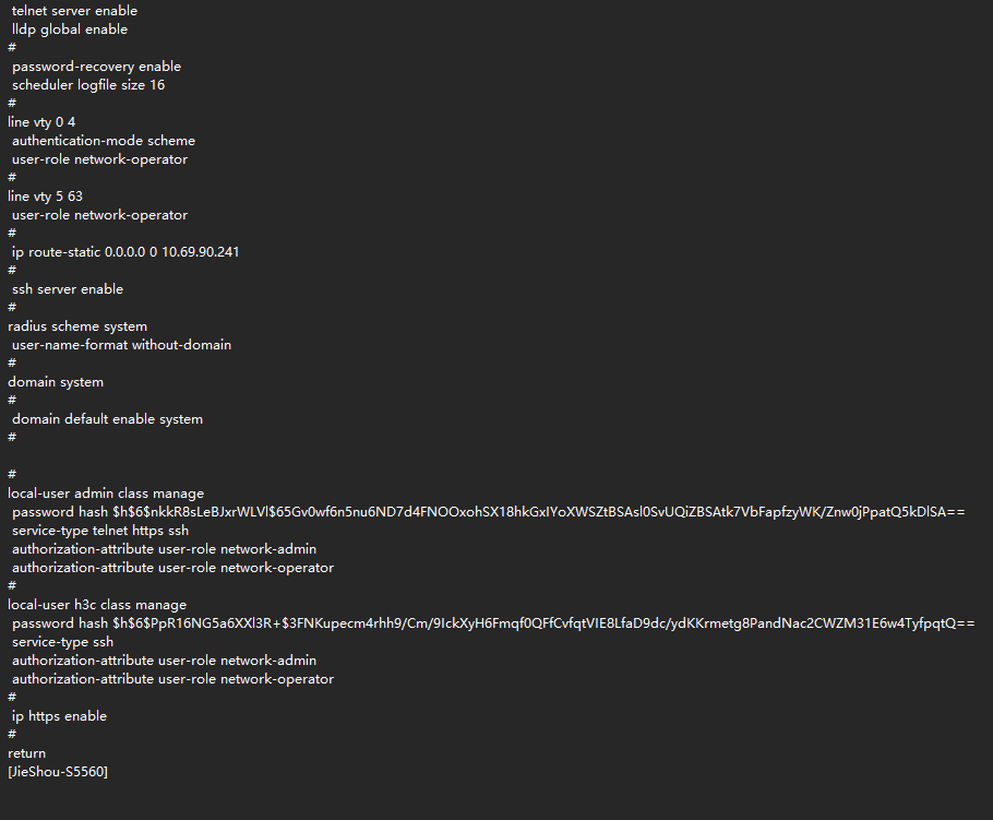 <JieShou-S5560>dis cu | include ssh ssh server enable service-type telnet https ssh service-type ssh <JieShou-S5560>dis cu | include telnet telnet server enable service-type telnet https ssh