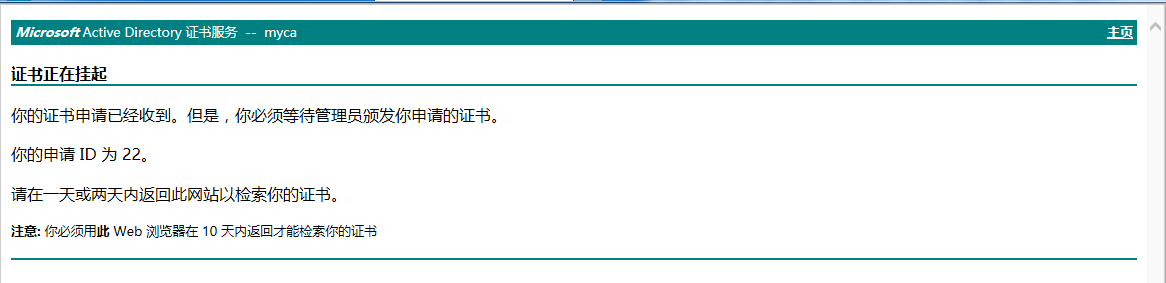 点击“提交”按钮,完成证书申请,此时证书状态为挂起。