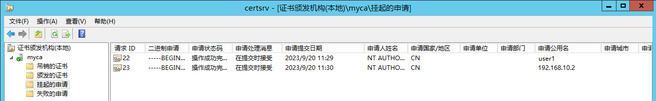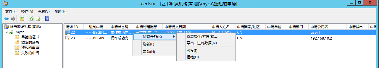 选择挂起的申请,点击“颁发”,完成证书的颁发。