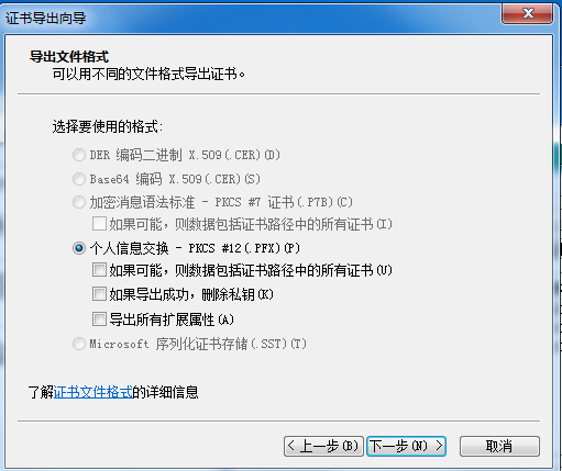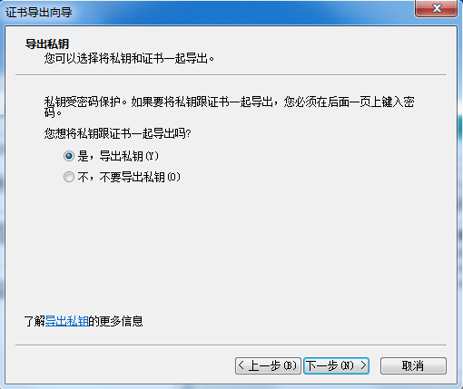 选择服务器端证书,点击“导出”按钮,选择连私钥一起导出。