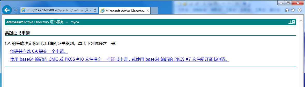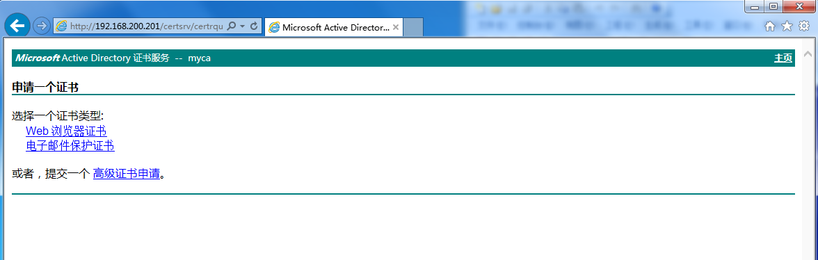 登录http://192.168.200.201/certsrv,进入首页,点击“申请证书”。