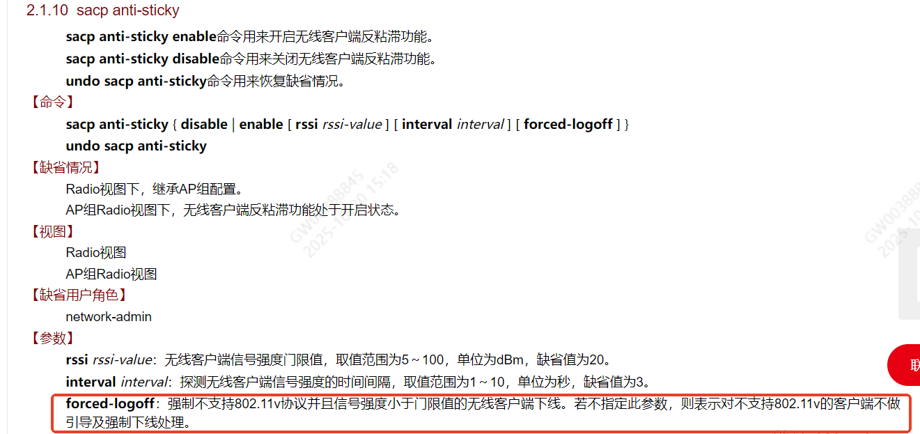 我想问一下如果开启了 sacp anti-sticky enable rssi 25 interval 5 forced-logoff是不是就是表面终端如果不支持 802.11v则就会强制下线,是下线之后重新连接信号好的,还是就直接下线然后要手动重新连接才行。然后问一下 如果信号重叠的多是否会出现断开连接然后需要手动重新连接情况
