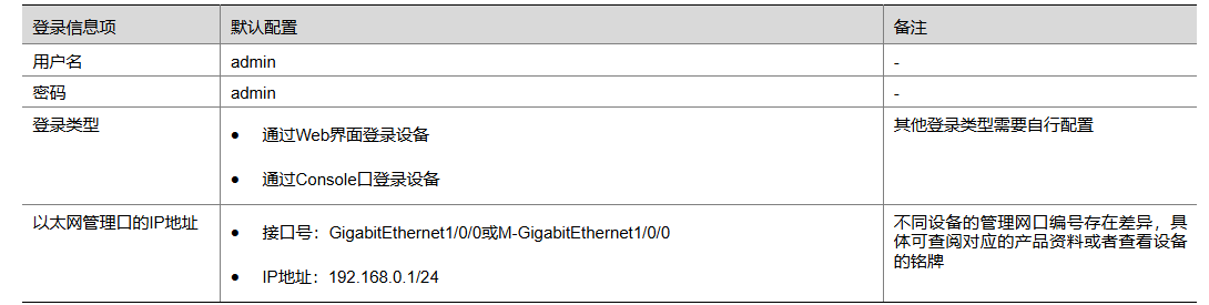 以太网管理口的IP地址 | · 接口号:GigabitEthernet1/0/0或M-GigabitEthernet1/0/0 · IP地址:192.168.0.1/24 | 不同设备的管理网口编号存在差异,具体可查阅对应的产品资料或者查看设备的铭牌 |