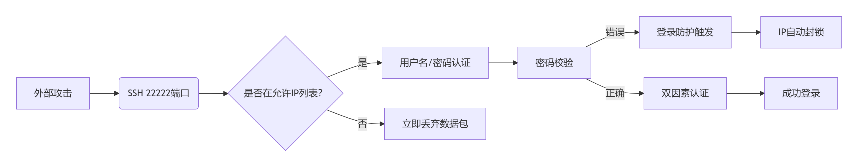 graph LR A[外部攻击] --> B(SSH 22222端口) B --> C{是否在允许IP列表?} C -->|是| D[用户名/密码认证] C -->|否| E[立即丢弃数据包] D --> F[密码校验] F -->|错误| G[登录防护触发] --> H[IP自动封锁] F -->|正确| I[双因素认证] --> J[成功登录]
