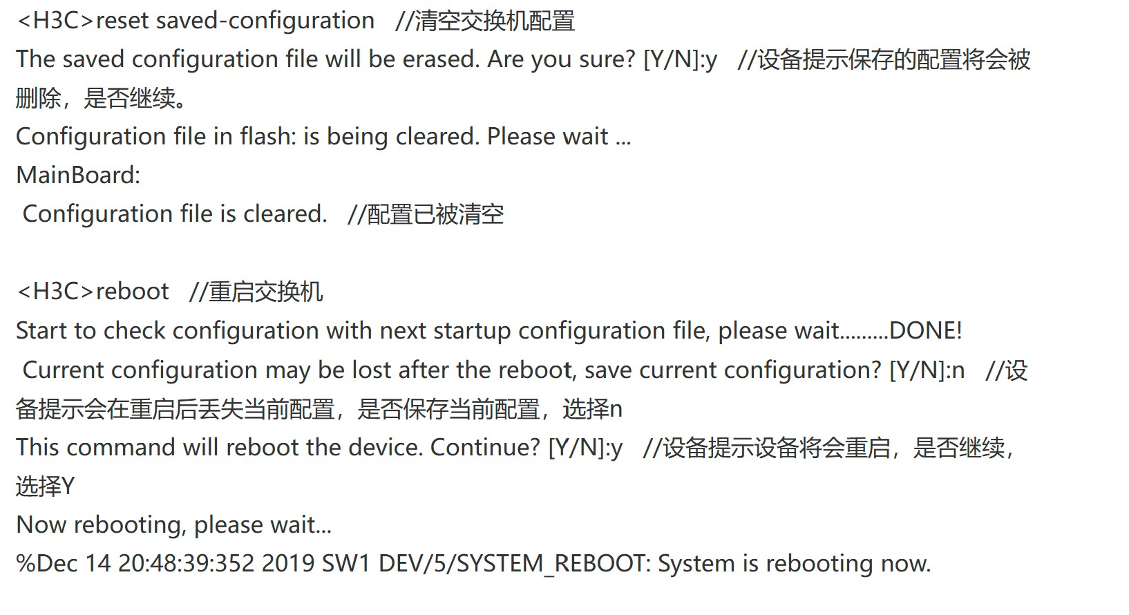 The saved configuration file will be erased. Are you sure? [Y/N]:y   //设备提示保存的配置将会被删除,是否继续。