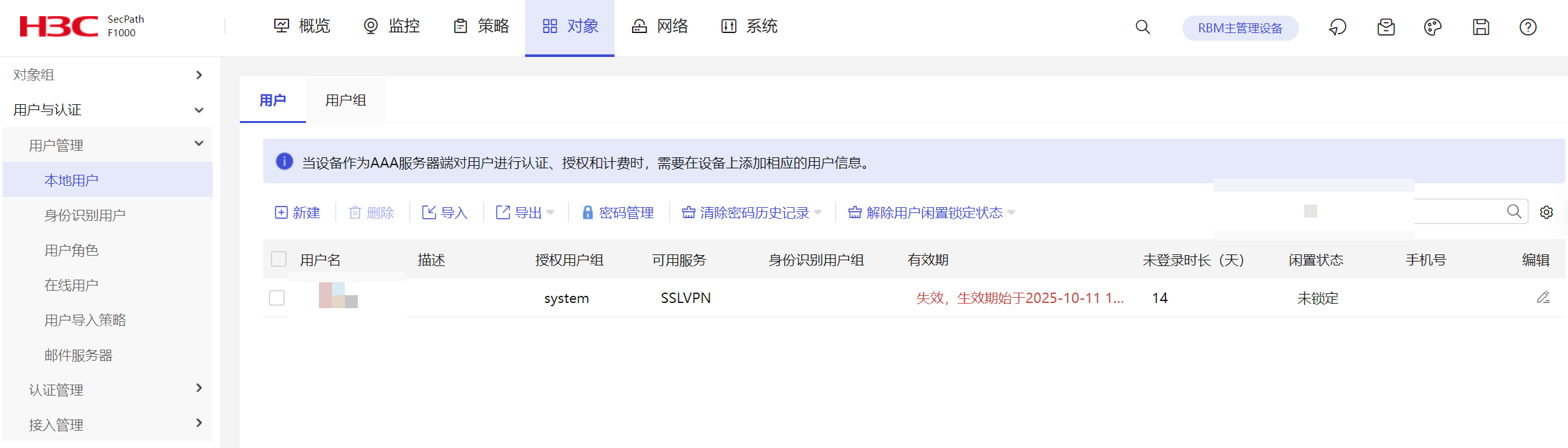 F1000防火墙本地用户设置有效期失效