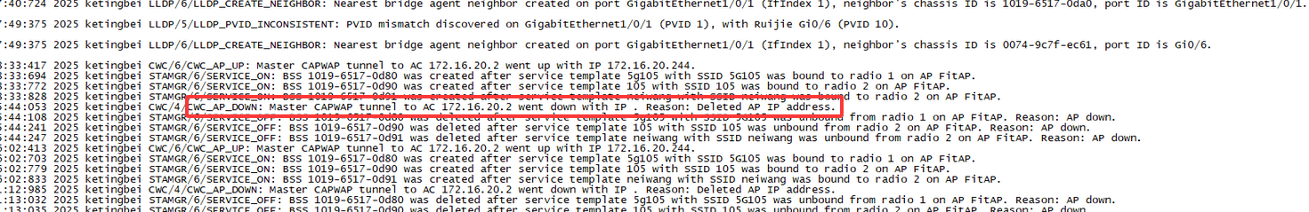 看掉线原因是删除了AP的IP地址,看看是否有这样的操作。AP如果是自动获取地址,是不是没有获取到地址导致掉线
