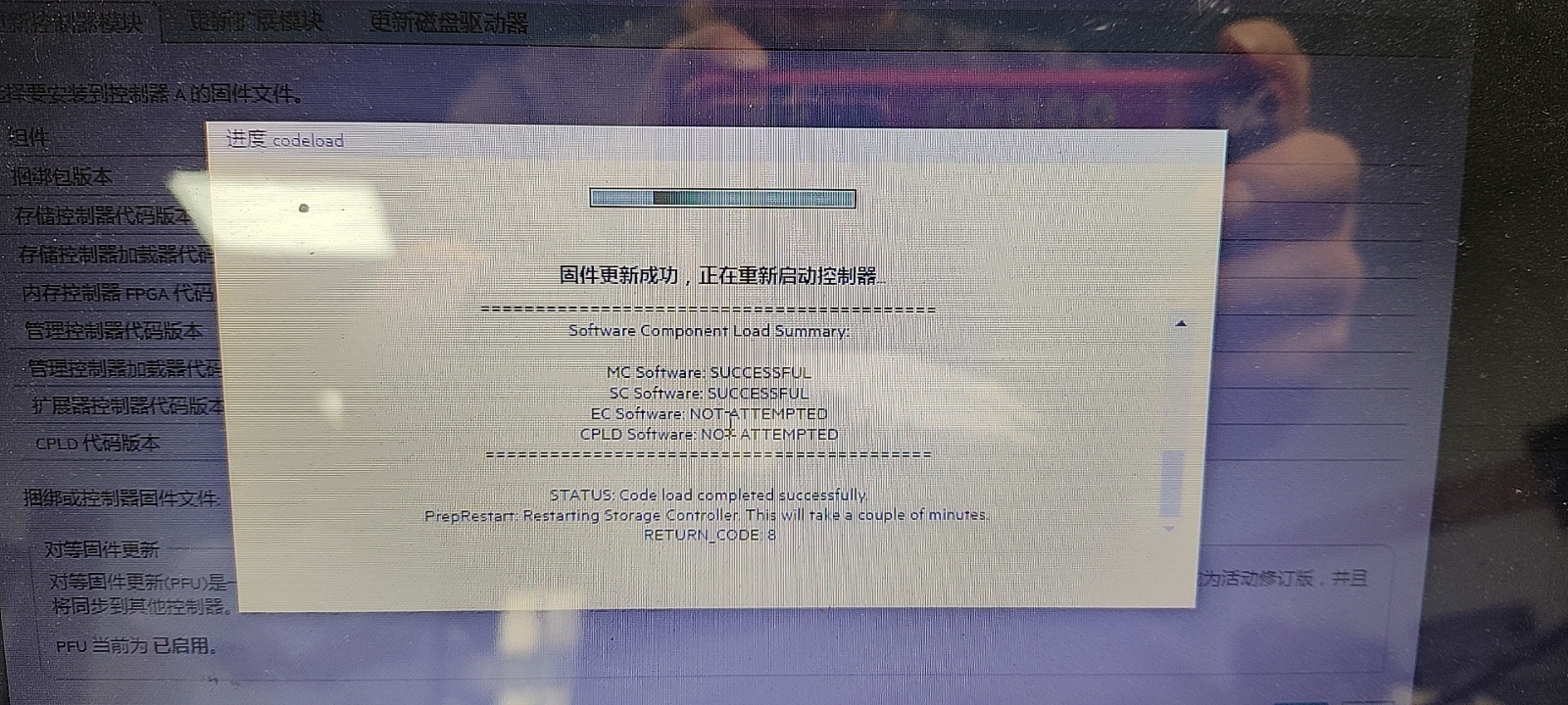 原因分析:从图3可以看到,固件更新过程显示“成功”,但注意看 Software Component Load Summary,其中 EC Software​ (扩展器控制器) 和 CPLD Software​ (复杂可编程逻辑器件) 的状态是 NOT-ATTEMPTED(未尝试)。这是一个关键线索。在MSA2040的固件更新逻辑中,为了确保系统安全,部分关键组件(如EC和CPLD)的更新不会在双控制器都在线时自动激活。它只更新了MC(管理控制器)和SC(存储控制器)的“备用”镜像。因此,您需要手动执行一个“主备控制器切换”操作,让新固件(包含已更新的MC和SC)成为活动版本。解决方案:分步激活新固件请严格按照以下步骤操作,操作前请确保当前没有重要的业务I/O在运行,因为切换过程会引起控制器短暂重启