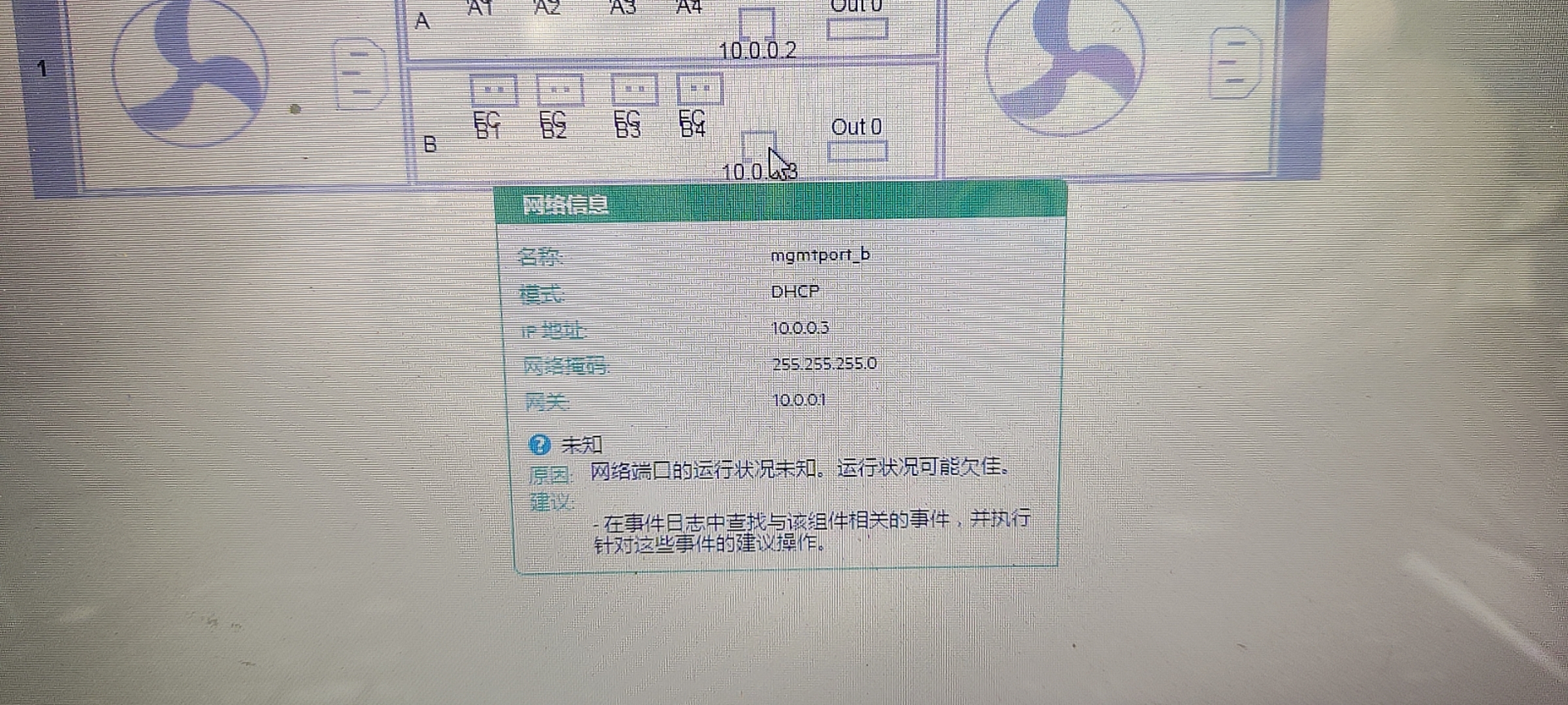 原因分析:从图2可以看到,管理口 mgmtport_b获得了IP地址(10.0.0.3),但状态是“未知”。系统给出的建议是“网络端口运行状况未知且可能欠佳”。这不直接等同于端口硬件损坏。更可能的原因有: