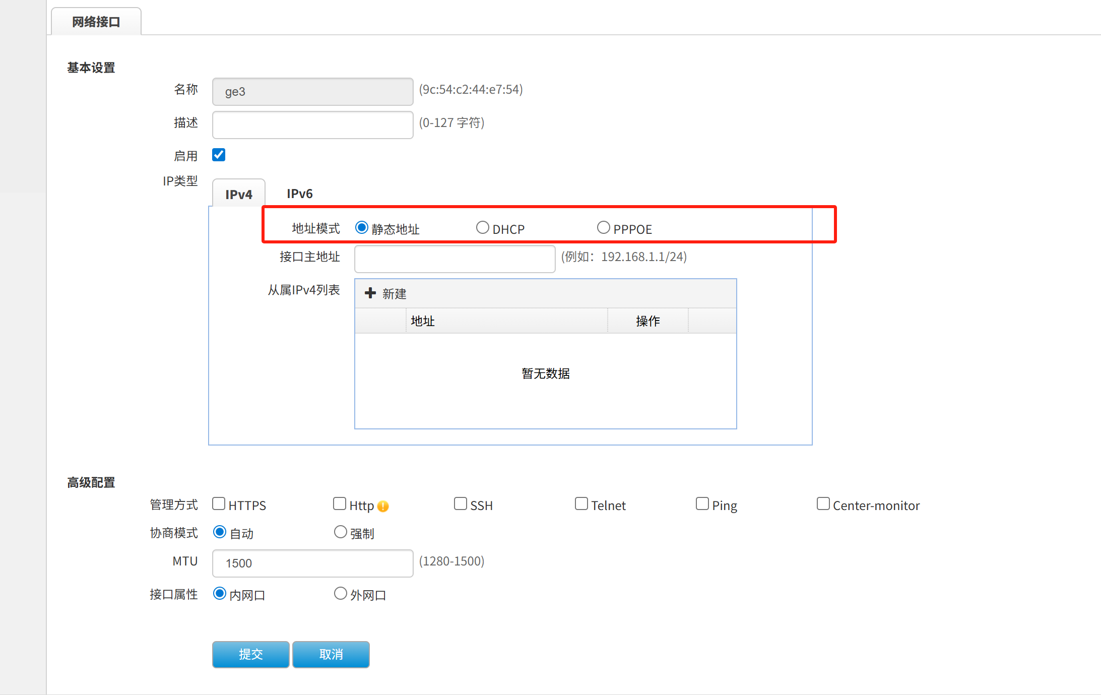 GE0口接的电信非国定IP光猫。。。接口配置的时候地址模式选择 静态IP还是 DHCP
