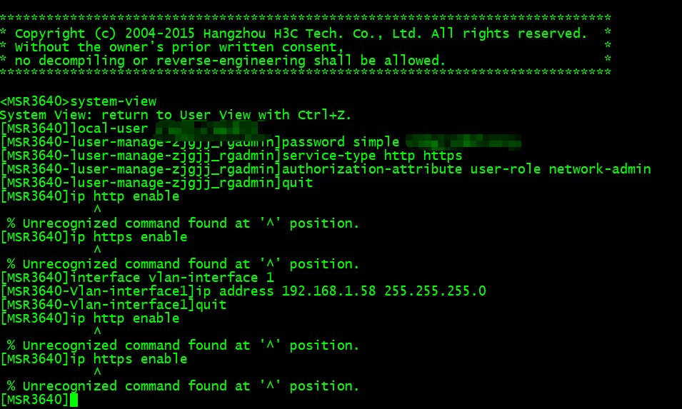 我还是不行哦 <MSR3640>system-view System View: return to User View with Ctrl+Z. [MSR3640]loca [MSR3640]local-user zjgjj_rgadmin [MSR3640-luser-manage-zjgjj_rgadmin]ser [MSR3640-luser-manage-zjgjj_rgadmin]service-type htt [MSR3640-luser-manage-zjgjj_rgadmin]service-type http [MSR3640-luser-manage-zjgjj_rgadmin]authorization-attribute user-role network-admin [MSR3640-luser-manage-zjgjj_rgadmin]pass [MSR3640-luser-manage-zjgjj_rgadmin]password [MSR3640-luser-manage-zjgjj_rgadmin]password sim [MSR3640-luser-manage-zjgjj_rgadmin]password simple ZJ@gjj2025inrg [MSR3640-luser-manage-zjgjj_rgadmin]quit [MSR3640]ip http ena [MSR3640]ip http enable ^ % Unrecognized command found at '^' position.