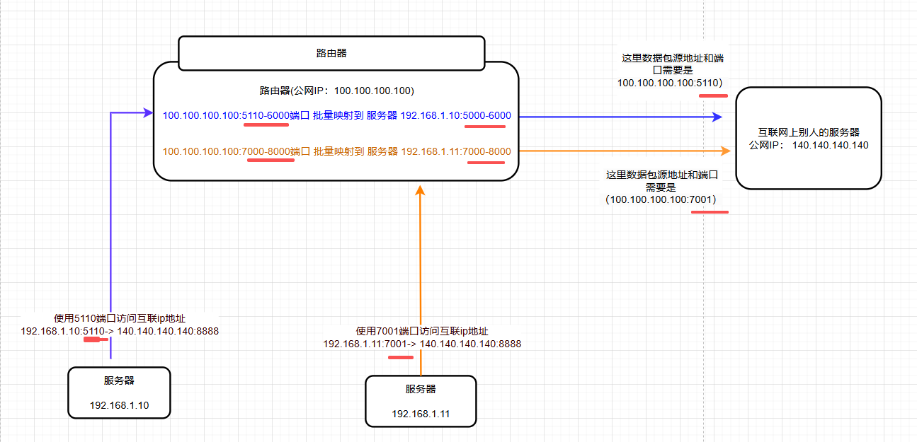 我可能需要的是这样的命令,但是不知道路由器是否可以实现 nat server protocol udp global 100.100.100.100 10000 15000 inside 192.168.1.2 10000 15000 reversible
