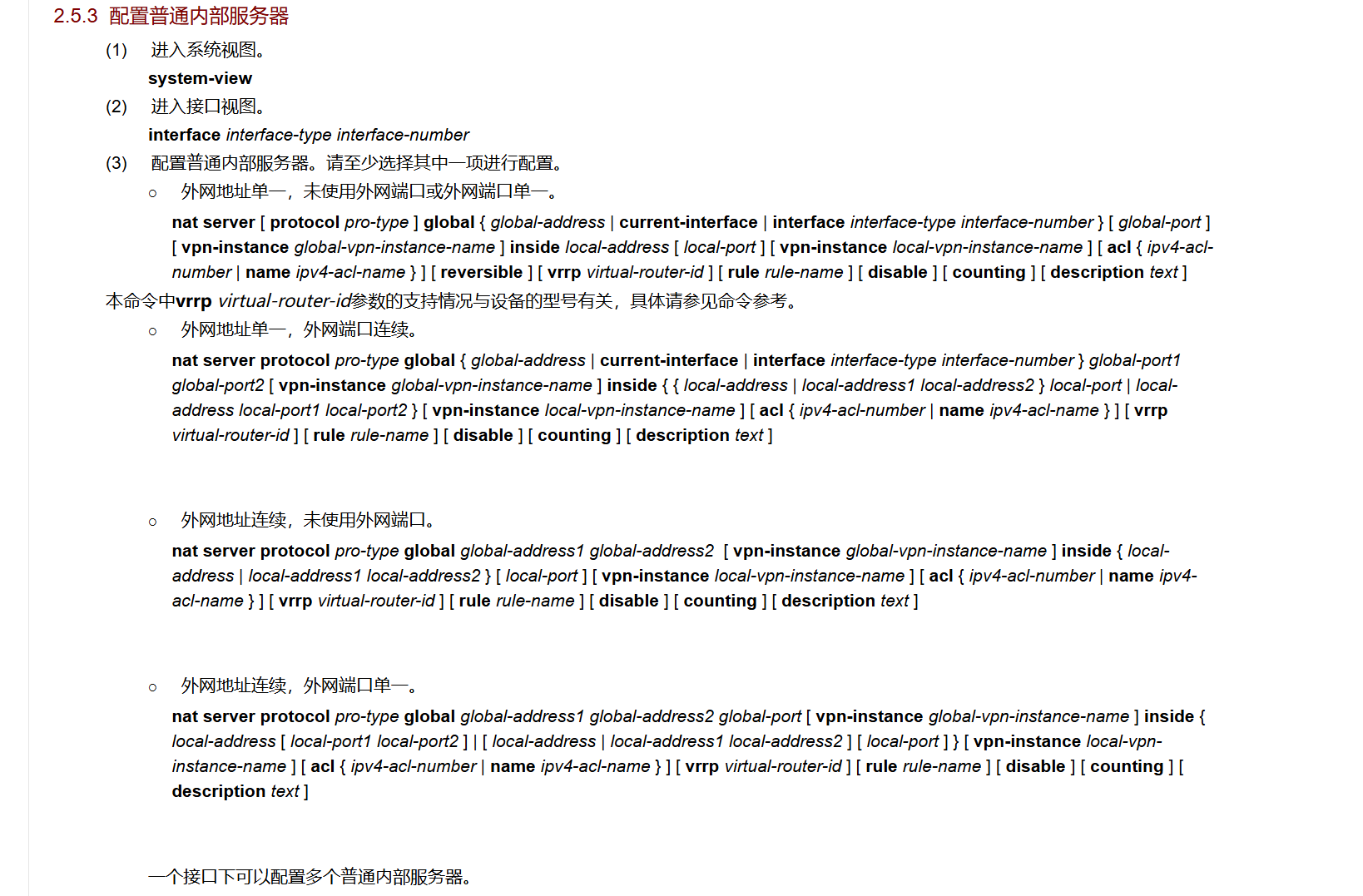 这是ai帮我写的,不知道能用吗? # 进入系统视图 system-view # 配置端口范围映射 nat server protocol tcp global 100.100.100.100 10000 15000 inside 192.168.1.2 10000 15000 nat server protocol udp global 100.100.100.100 10000 15000 inside 192.168.1.2 10000 15000 nat server protocol tcp global 100.100.100.100 20000 30000 inside 192.168.1.3 20000 30000 nat server protocol udp global 100.100.100.100 20000 30000 inside 192.168.1.3 20000 30000 # 配置源地址一致性映射 acl number 3000 rule 5 permit source 192.168.1.2 0 rule 10 permit source 192.168.1.3 0 # 应用NAT到外网接口 interface GigabitEthernet0/0 # 假设这是外网接口 nat outbound 3000 nat server enable