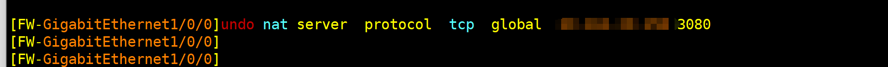 在使用display this 查看存在“nat server protocol tcp global 62.157.217.229 60002 inside 173.19.28.30 60002 rule ServerRule_115”映射的情况下,执行 "undo nat server protocol tcp global 62.157.217.229 60002 inside 173.19.28.30 60002 rule ServerRule_115"  命令报错:% wrong parameter found at "^" position 此时 ^指向 inside之“i"位置。 请专家指点。