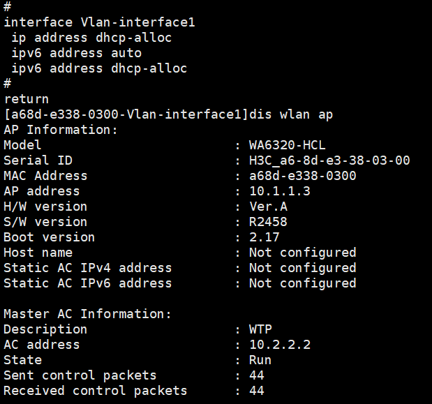 在交换机上测试op43 属性,AC 与AP为跨网段,dhcp 中包含op43 属性。