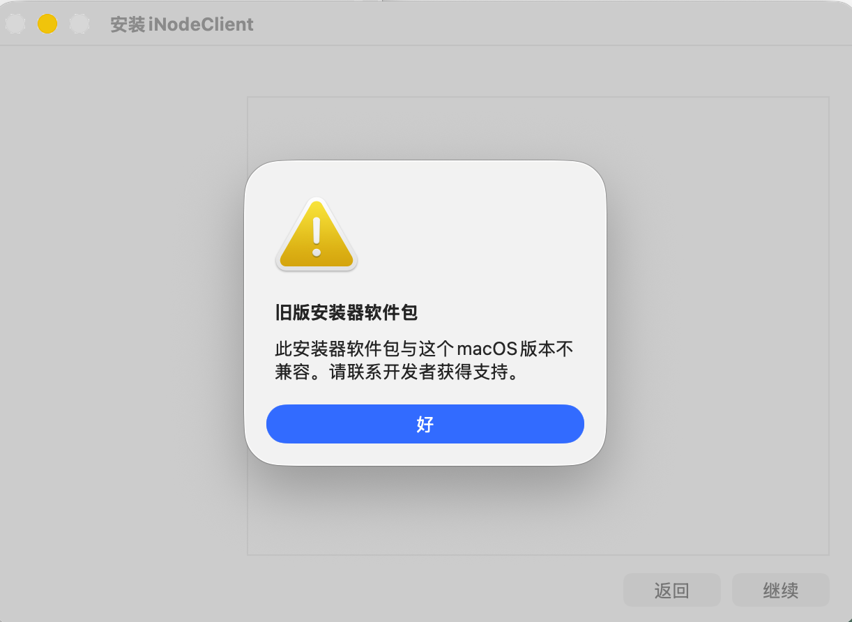 在m4芯片macOS26系统上安装iNodeClient时报错“旧版安装器软件包 此安装器软件包于这个macOS版本不兼容。请联系开发者获得支持。”