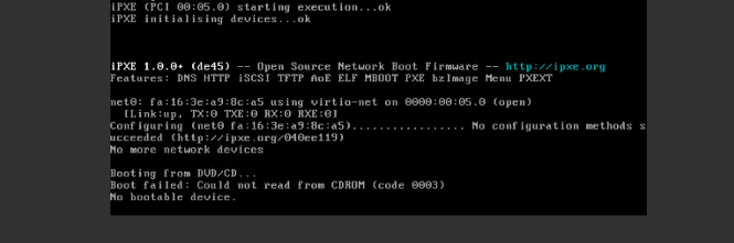 根据你的截图,iPXE 未能成功完成网络配置(通常是 DHCP 阶段),系统才会提示这个错误,并最终显示“No bootable device”。