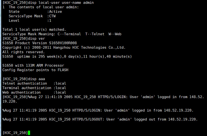 这台交换机版本很老,只有LEVEL0 和 1。手上有好几台S1650,就这台登录不了,其它机器都正常,所以肯定不是浏览器的问题。我想不明白,我到底是哪里配置错了。 [H3C_19_250-luser-admin]? display Display current system information level Specify level of user password Specify password of local user ping Ping function quit Exit from current command view save Save current configuration service-type Specify service-type of local user state Specify state of local user undo Cancel current setting [H3C_19_250-luser-admin]level ? INTEGER<0-1> Level of user, 0 is monitor user, 1 is administrator [H3C_19_250-luser-admin]level 1