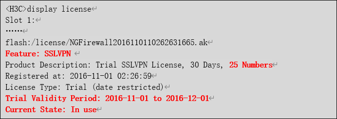Comware V7防火墙在未安装SSLVPN license时,仅可以使用15个用户,如果想扩充用户数,则需要购买license。因此,需要首先查看设备是否已安装SSLVPN license以及license是否有效。