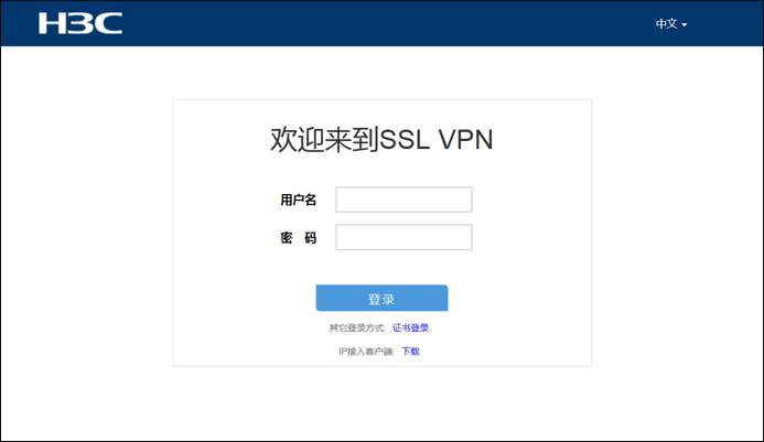 完成SSL VPN网关配置并在SSL VPN访问实例引用SSL VPN网关,使能SSL VPN网关功能和SSL VPN访问实例功能,然后在浏览器输入网关地址及端口号就能打开SSL VPN首页,如图 1所示。如果打不开SSL VPN首页,说明SSL VPN网关配置有误,需要检查sslvpn gateway的相关配置。