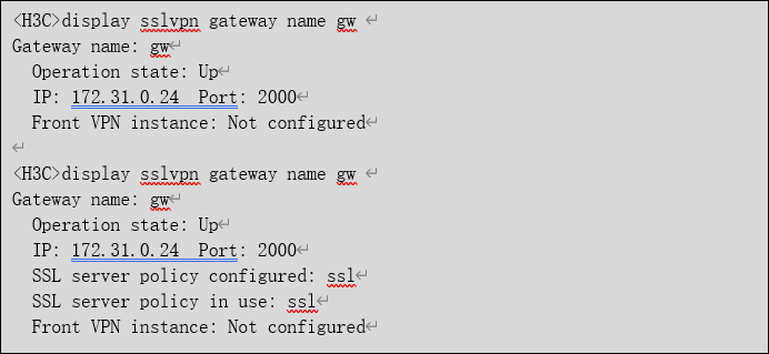 D032分支鼓励使用Web界面操作,命令行同样也支持查看网关状态,通过display sslvpn gateway命令查看网关Operation state状态,当引用了服务器端策略会显示策略名称,如没有引用,则不显示任何SSL server policy参数。