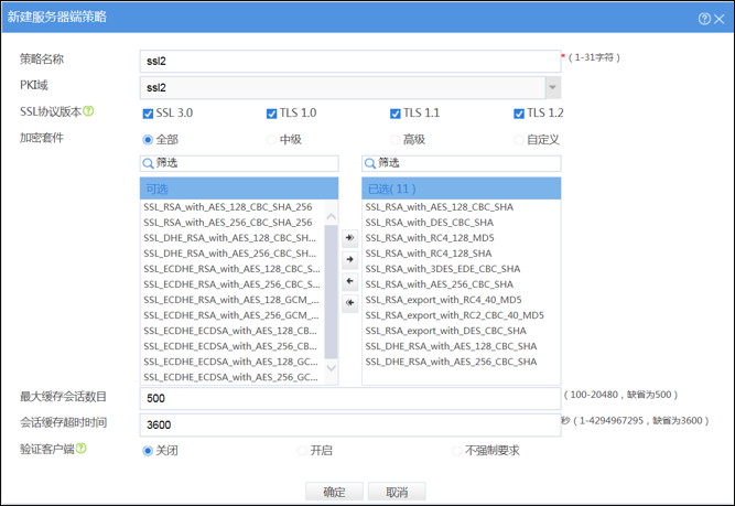 通过Web导航栏“对象>SSL>服务器端策略”进入配置页面,点击<新建>进入新建服务器端策略弹框,填写策略名称ssl2,引用刚才创建的PKI域ssl2,点击确定后完成。