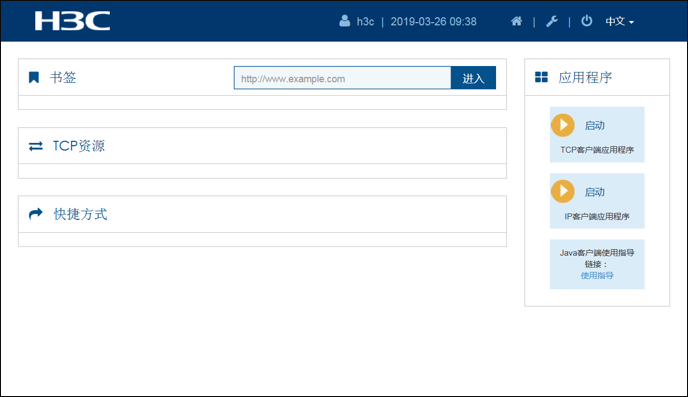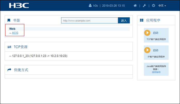 Web接入方式中,所有数据的显示和操作都是通过Web页面进行的。登录SSL VPN首页输入用户名/密码,单击<登录>按钮,可以成功登录SSL VPN网关。网关首页的“书签”栏显示h3c用户可以访问的Web资源ACG,如图 14所示。