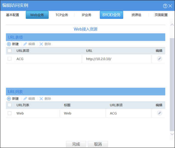 Web接入方式下,管理员需要在SSL VPN网关上创建URL列表,URL表项为企业网内部服务器的IP地址(或域名)。通过Web导航栏“网络>SSL VPN>访问实例”新建实例或者编辑已有实例,查看Web业务配置,如图 15所示,新建URL表项ACG,并在URL列表Web里引用表项ACG。