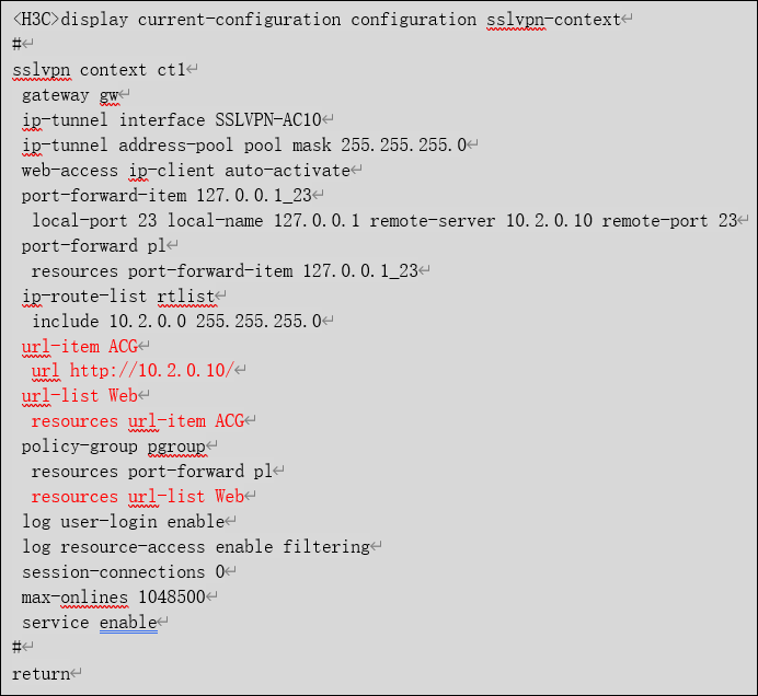例如:配置AC口10、客户端地址池pool以及端口路由表项rtlist,并在资源组pgroup下引用。