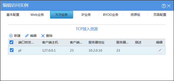 通过Web导航栏“网络>SSL VPN>访问实例”新建实例或者编辑已有实例,查看TCP业务配置,如图 19所示,创建端口转发表项pl,添加端口转发实例,将10.2.0.10提供的Telnet服务映射到本地地址127.0.0.1、本地端口23。