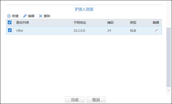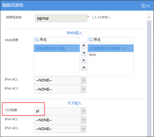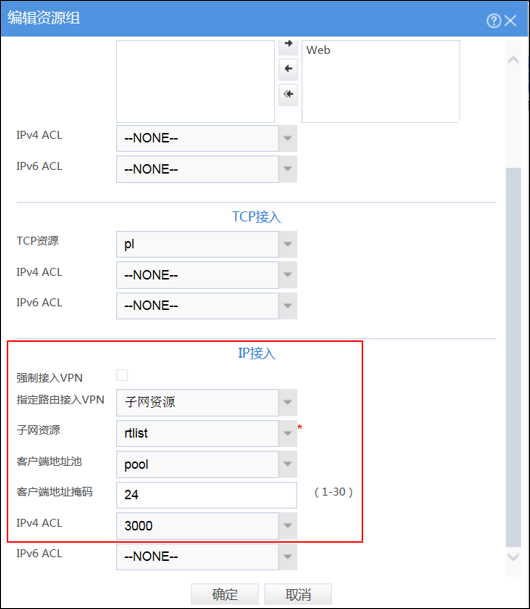 完成IP业务配置后,还需要在资源组pgroup里引用IP资源,如图 30所示,引用路由列表rtlist和SSL VPN客户端地址池pool,并同时配置对IP接入进行ACL过滤。其中ACL过滤的是inode客户端获取的地址池地址,一般配置为全允许。