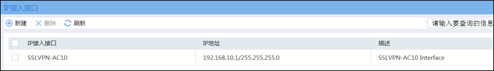 IP接入方式下,管理员在SSL VPN网关上创建SSL VPN AC接口,并配置下发给SSL VPN客户端的路由表项。通过Web导航栏“网络>SSL VPN>IP接入接口”查看AC口配置,如图 26所示。需要注意AC口需要加入安全域,并且要放通AC口所在安全域到内网安全域的安全策略,如果客户端要ping通AC口还需放通AC口所在安全域到本地的安全策略。