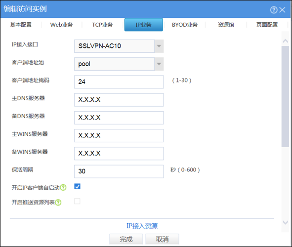 通过Web导航栏“网络>SSL VPN>访问实例”新建实例或者编辑已有实例,查看IP业务配置,如图 28所示,引用的SSL VPN AC接口10和SSL VPN客户端地址池pool。然后下拉配置窗口,查看IP接入资源,即路由表项是否配置正确。
