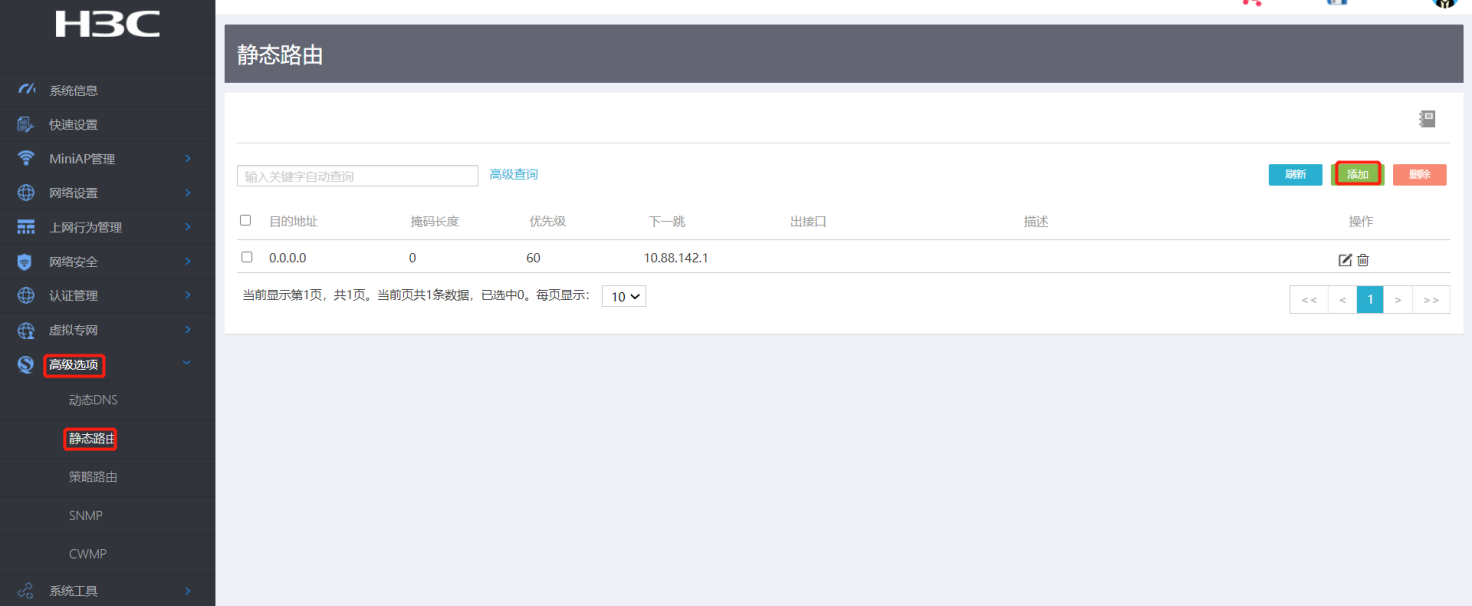 #高级选项-静态路由,添加两条静态路由