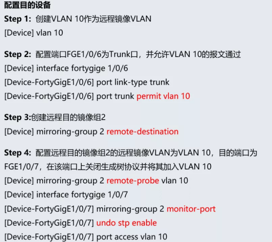 建议先配置⽬的设备,再配置中间设备,最后配置源设备,以保证镜像流量的正常转发。