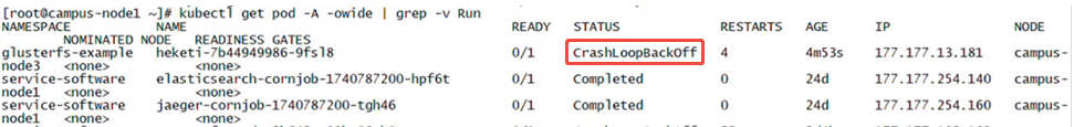 在统一数字底盘后台执行kubectl get pod -A -owide | grep -v Run命令,发现heketi pod的状态为CrashLoopBackOff,如下图所示: