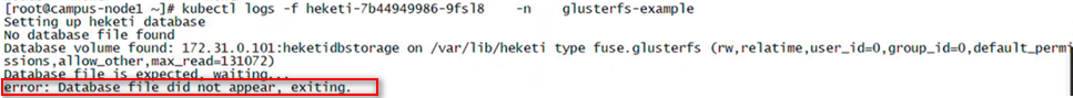 继续执行kubectl logs -f heketi-xxx(heketi pod名称)-n glusterfs-example命令,发现提示“数据库文件不存在”的错误,如下图所示: