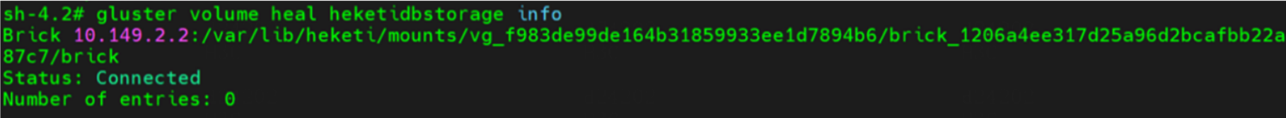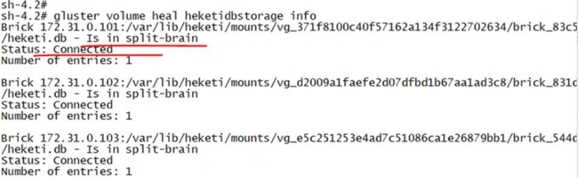 (1)临时规避方案:登录任一gluster pod后台执行gluster volume heal heketidbstorage split-brain latest-mtime /heketi.db命令进行修复。修复后再执行gluster volume heal heketidbstorage info命令,可以看到如下正常回显: