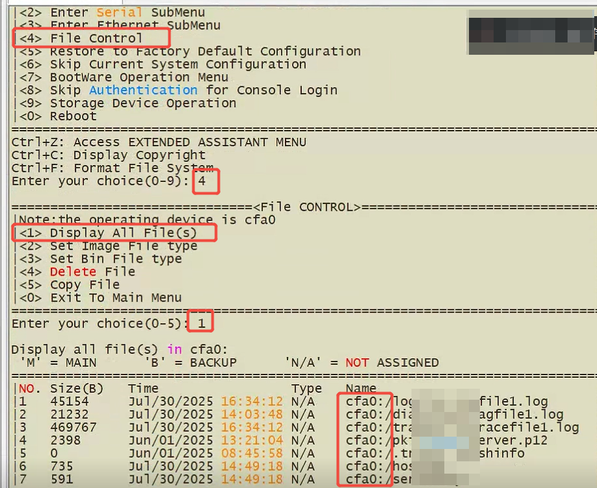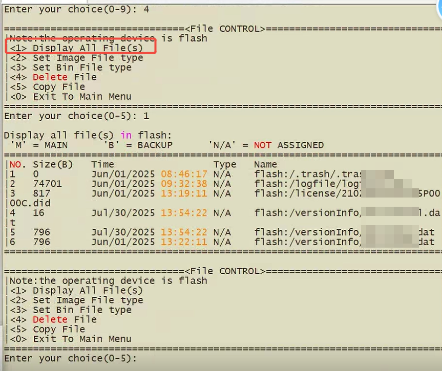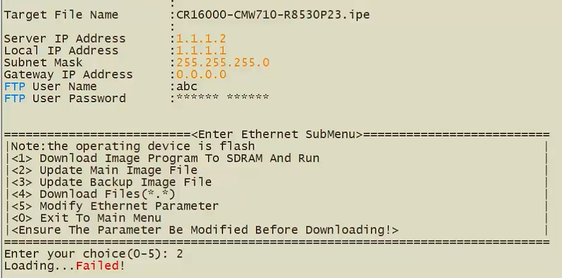 1、bootware升级时,使用ftp、tftp均无法正常导入文件(2和4均报错),直接提示Loading...Failed!,格式化后故障依旧:
