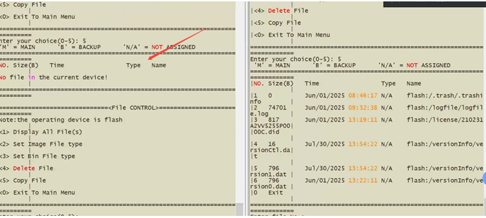 上图左边为格式化后设备,右边为未格式化设备。未格式化设备也只有flash内存在之前的文件(之前版本文件在cfa0内)。