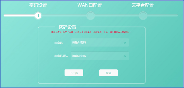 2)运行浏览器,在地址栏中输入http://wlan.h3c.com或者http://10.40.92.1(缺省管理地址),回车后跳转到初始化设置页面,请根据页面提示的密码设置要求设置登录密码,点击<下一步>按钮,进入WAN口配置页面。