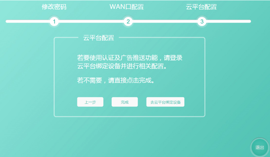 4)在云平台配置页面,若要对设备进行远程管理和配置,请点击<去云平台绑定设备>按钮,并登录云平台进行相关配置。若不需要,请直接点击<完成>或者<退出>按钮,在弹出的登录页面输入设置的登录密码完成登录