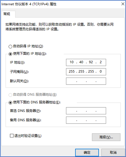 手动修改PC的IP地址为10.40.92.0/24网段内的任意地址(除10.40.92.1),例如10.40.92.2。(注意:后期修改了缺省登录地址后,请使用修改后的网段内的IP地址)