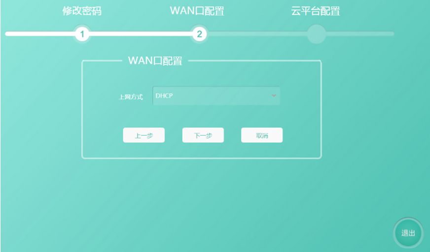 3)在WAN口配置页面,根据实际使用的运营商网络选择上网方式,上网方式包括:PPPoE、DHCP和静态地址。完成上网方式选择后,点击<下一步>按钮,进入云平台配置页面。若当前不需要配置WAN口和云平台,可以点击页面右下角的<退出>按钮,在弹出的登录页面输入设置的登录密码完成登录。
