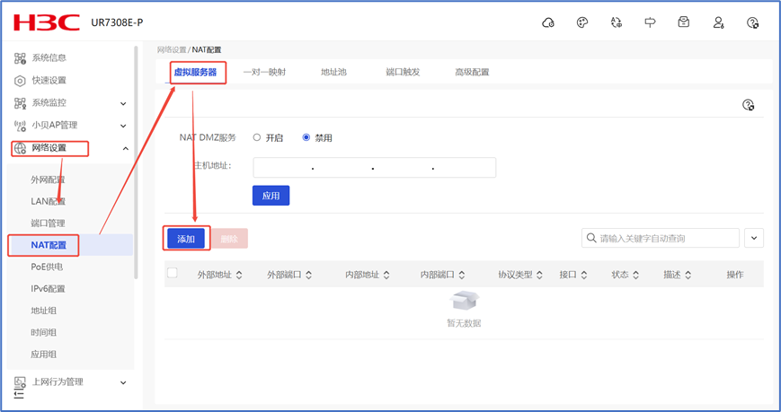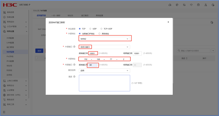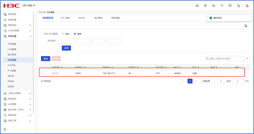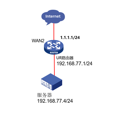 UR 路由器部署在互联网出口,内网有一台服务器(192.168.77.4)通过路由器发布了80端口,外网用户需要通过路由器来访问内部的服务器。