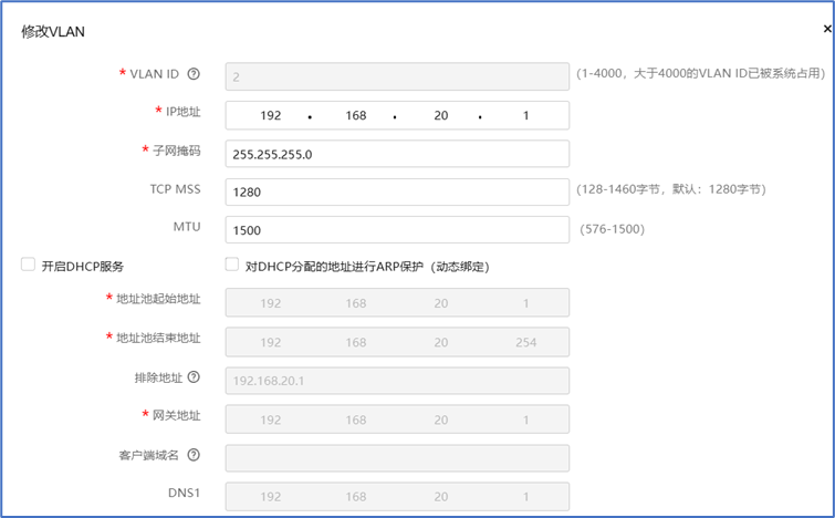 dns-list 114.114.114.114 //配置DHCP地址池vlan1为DHCP客户端分配的DNS服务器地址为114.114.114.114