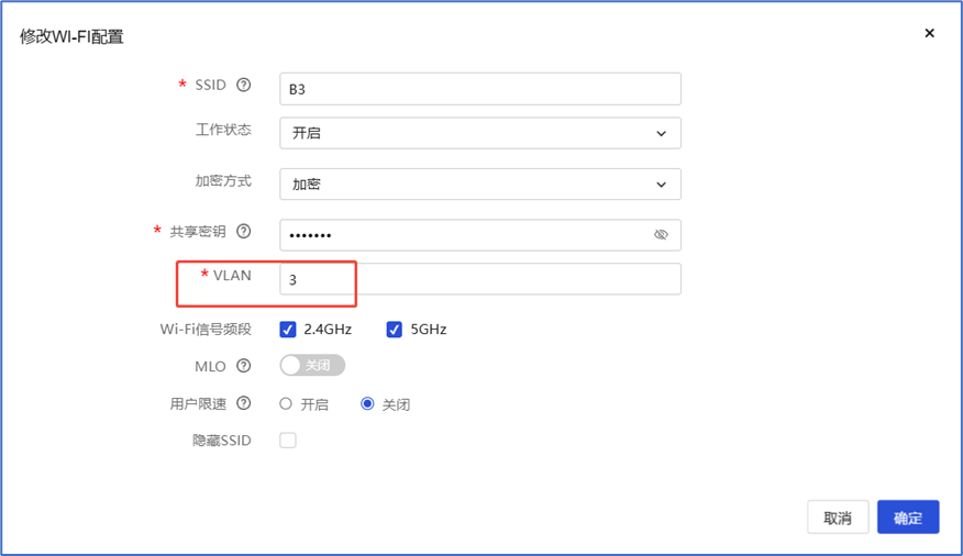 创建第二个wifi,ssid名称是B3,桥接业务vlan3