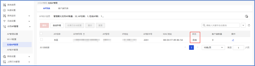【小贝AP管理】-【在线AP管理】确认AP有上线到UR路由器上面