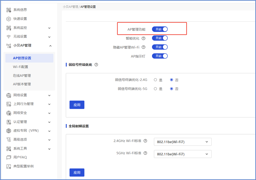 【小贝AP管理】-【AP管理设置】确认AP管理功能是开启的